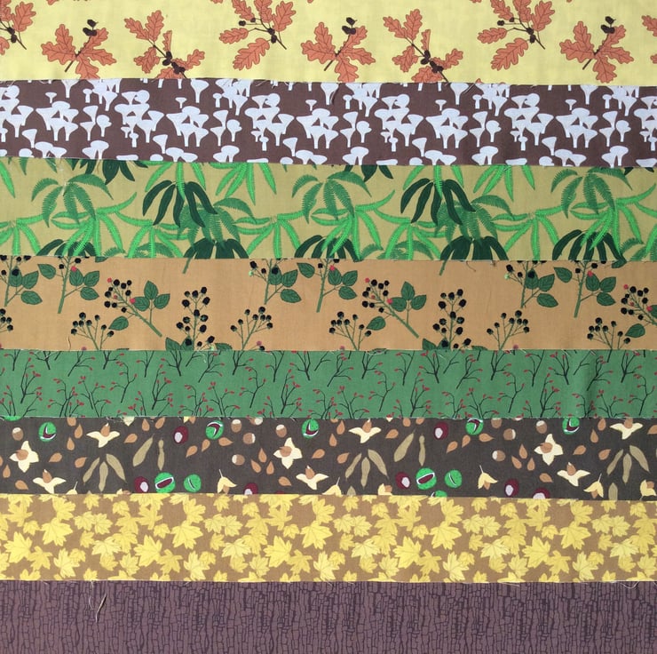 Eight warm Autumn woodland fabrics. All original designs by me. The fabric is suitable for patchwork, quilting, English paper piecing and many other sewing projects.