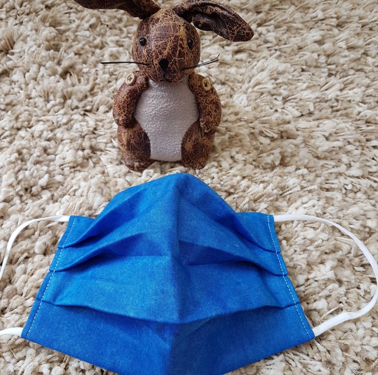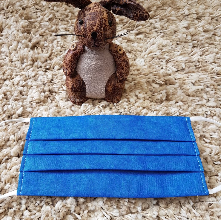 Adult face covering made from a denim blue mottled cotton. The face mask is made with 2 layers of cotton forming an inner pocket for a filter (not included) and is fastened over the ears with 2 loops of elastic.