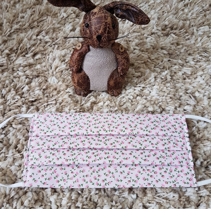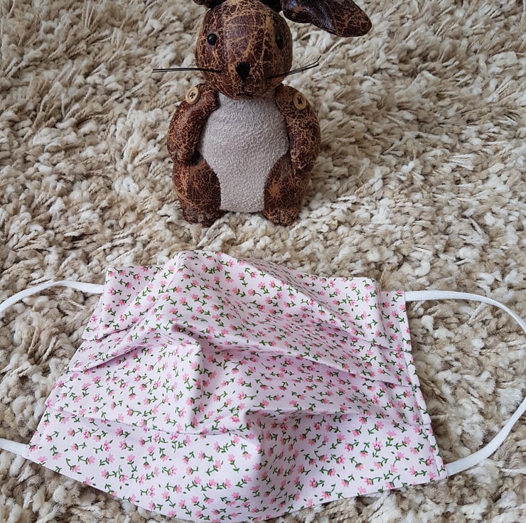 Adult face covering made from a pink ditsy flower print on pale pink cotton. The face mask is made with 2 layers of cotton forming an inner pocket for a filter (not included) and is fastened over the ears with 2 loops of elastic and a toggle adjuster.