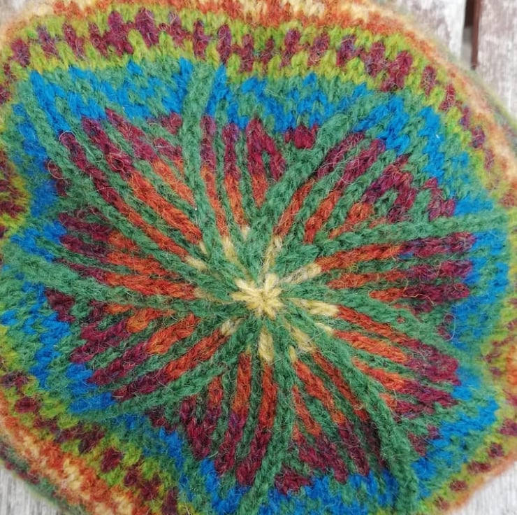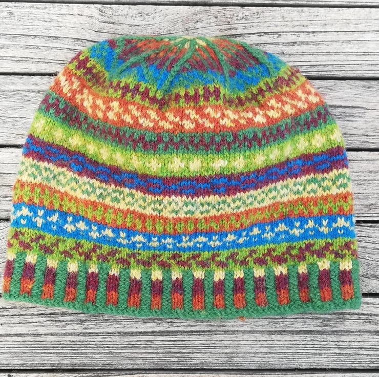 This beanie is perfect for learning, practicing and even designing your own Fair Isle, also for working in the round. The patterns are simple peeries, (small Fair Isle patterns) 3 or 4 row of 3 – 6 stitch repeats. The pattern lays out a suggested order and colour way design, building complexity of stitches as you progress. However, you can design your own hat by choosing from the 9 peeries illustrated. As the first and last row of each pattern is a single colour knit row the beanie will grow quickly and gives a break from the Fair Isle practice.