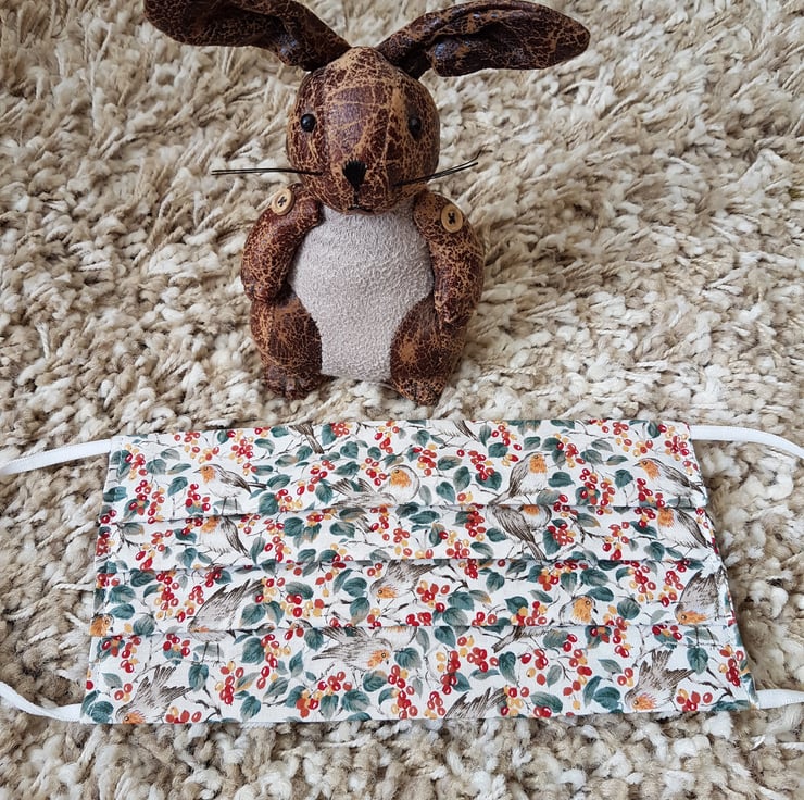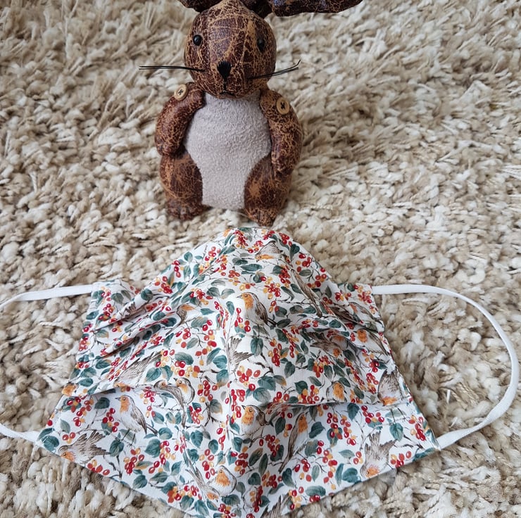 Adult face covering made from a robins and berries print on cream cotton. The face mask is made with 2 layers of cotton forming an inner pocket for a filter (not included) and is fastened over the ears with 2 loops of elastic and a toggle adjuster.
