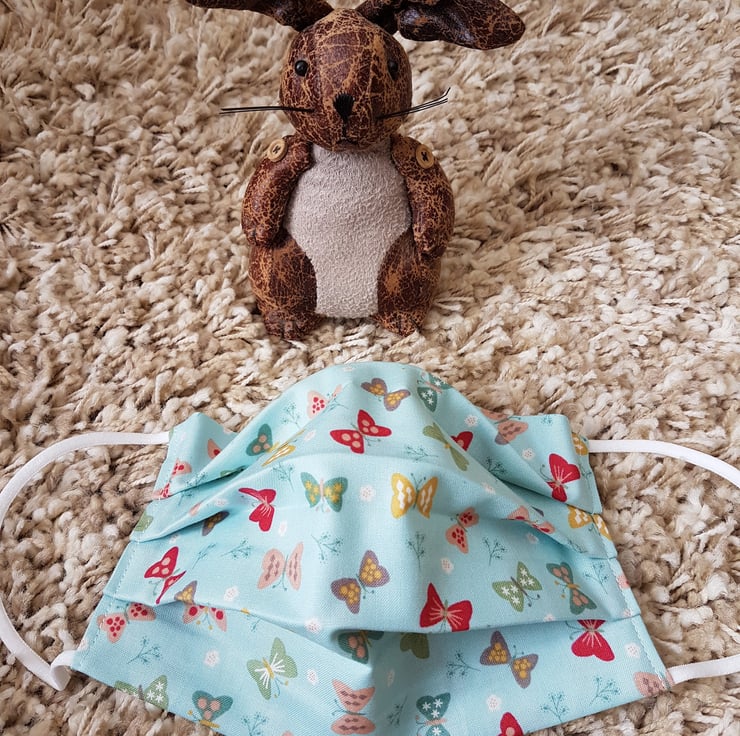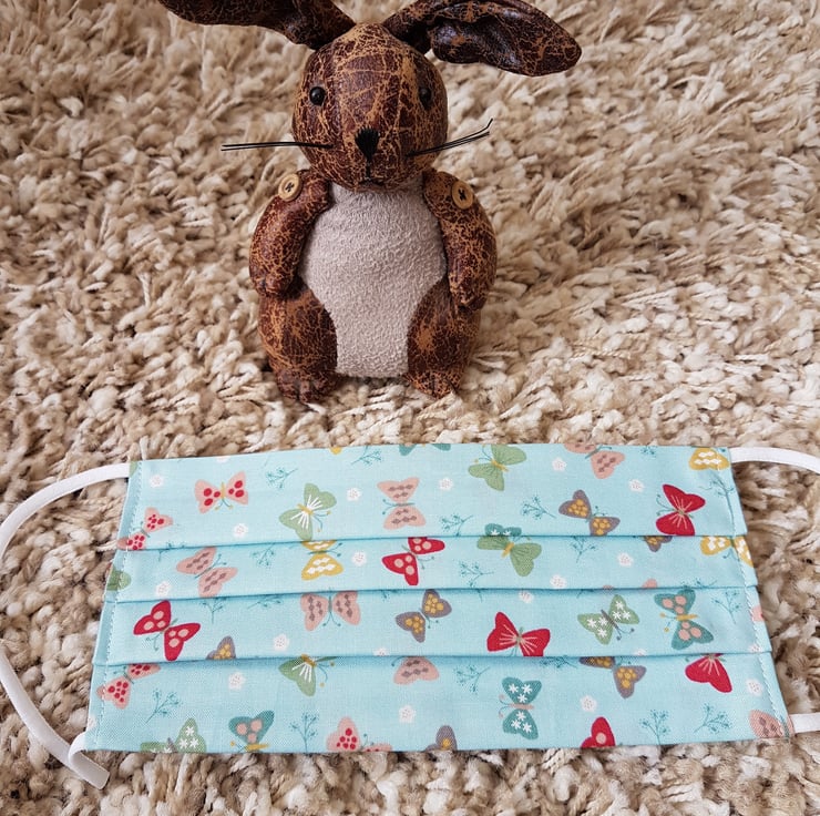 Adult face covering made from a multi butterfly print on aqua cotton. The face mask is made with 2 layers of cotton forming an inner pocket for a filter (not included) and is fastened over the ears with 2 loops of elastic and a toggle adjuster.