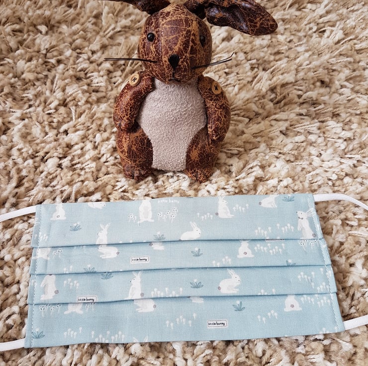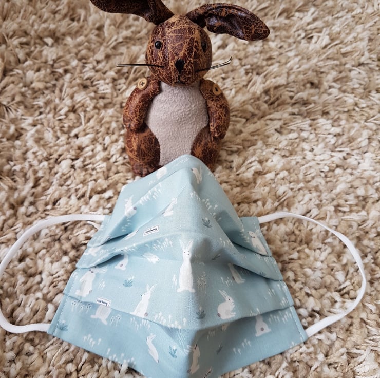 Adult face covering made from a 'Hello Little Bunny' print on duck-egg cotton. The face mask is made with 2 layers of cotton forming an inner pocket for a filter (not included) and is fastened over the ears with 2 loops of elastic and a toggle adjuster.
