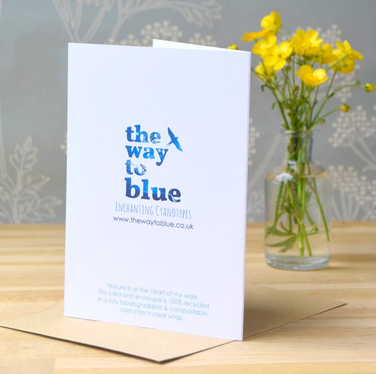 Nature is at the heart of my work. The recycled white card measures 10.5 x 15cm and is supplied with a ribbed brown recycled envelope in an eco-friendly clear wrap (made from corn starch these are fully biodegradable and compostable.)