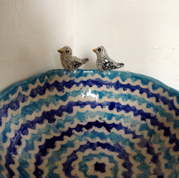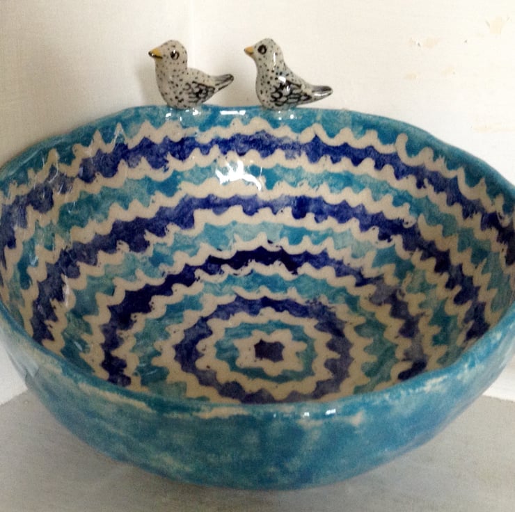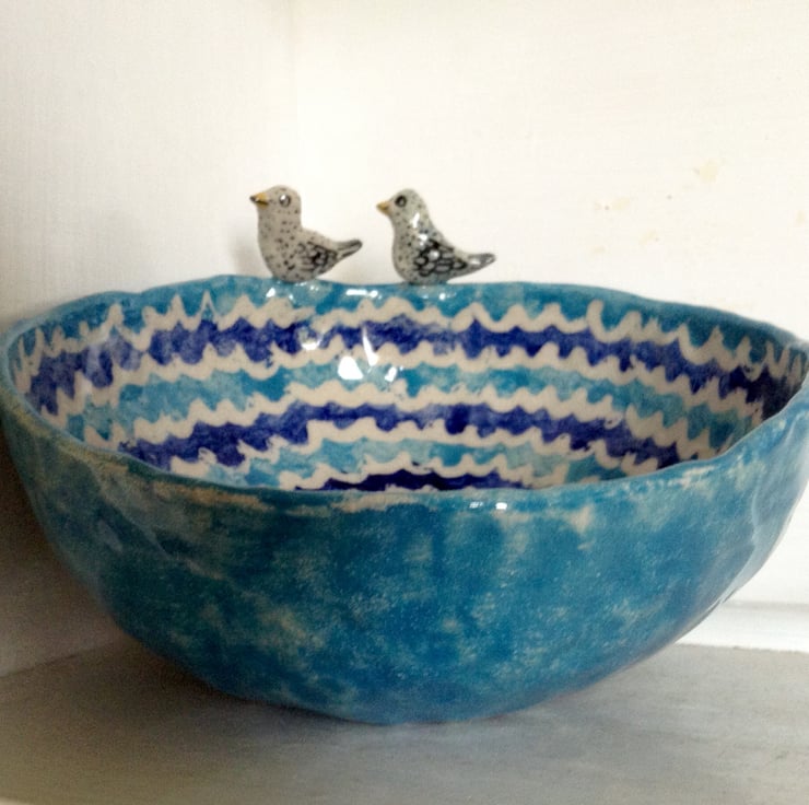 Very unusual stoneware bowl with two little hand modelled ducks on the rim. The bowl is totally handmade, without the use of a pottery wheel and is therefore pleasingly irregular in shape, with more weight to it than a wheel thrown bowl. It is decorated with dark blue, pale blue and cream coloured wavy stripes on the inside with a pale blue exterior. It has a clear glossy stoneware glaze. It measures 18.5 cms across and is 6.5 cms deep and makes a perfect fruit bowl.