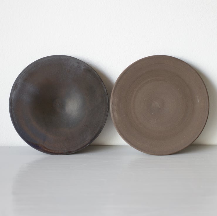 The saucers are a flat disc shape with a footring on the base. These are available in either a glazed or unglazed finish as seen in the fifth photo. Please leave a note in the 'comments to seller' with your chosen preference - glazed (left) or unglazed (right).