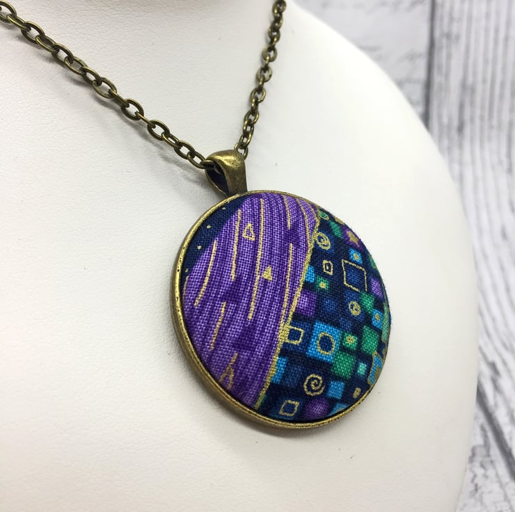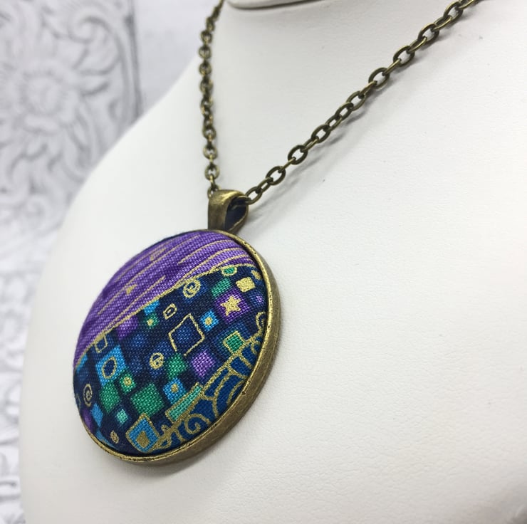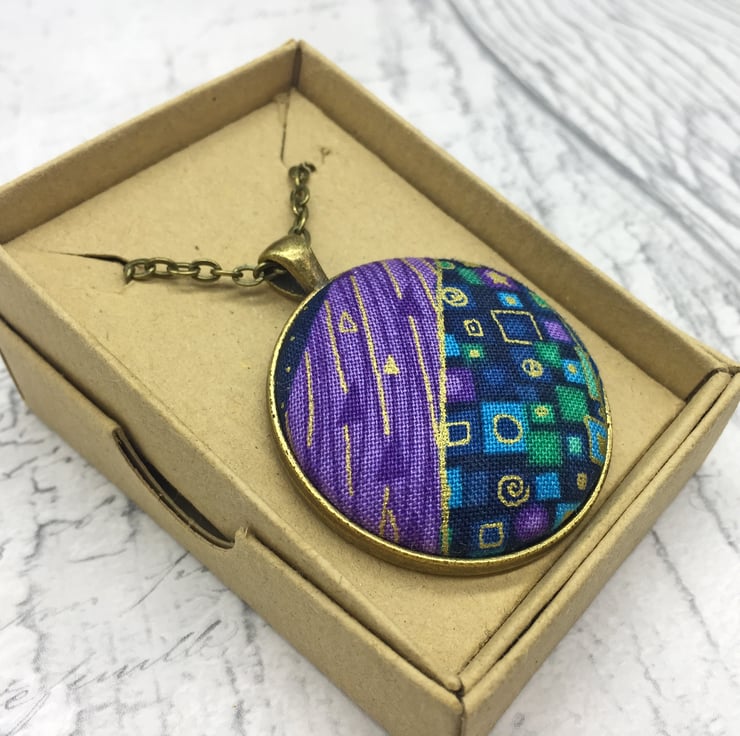 Geometric patterns abound in this beautiful Gustav Klimt inspired fabric button pendant.