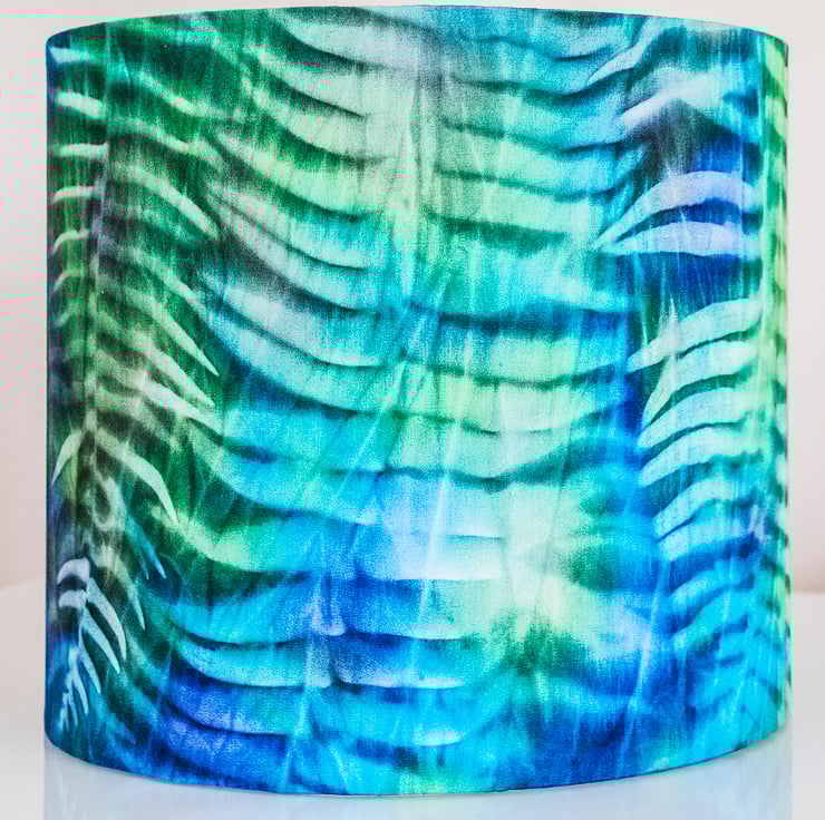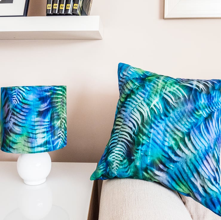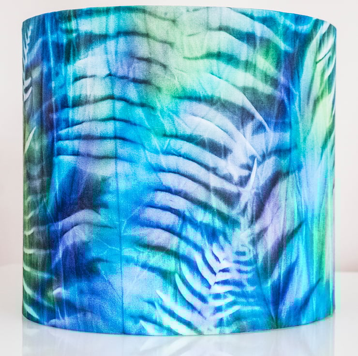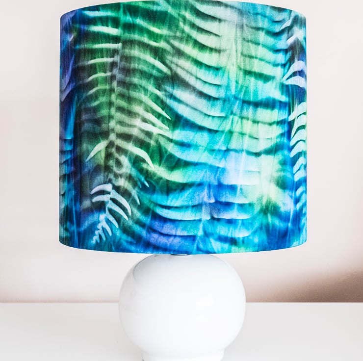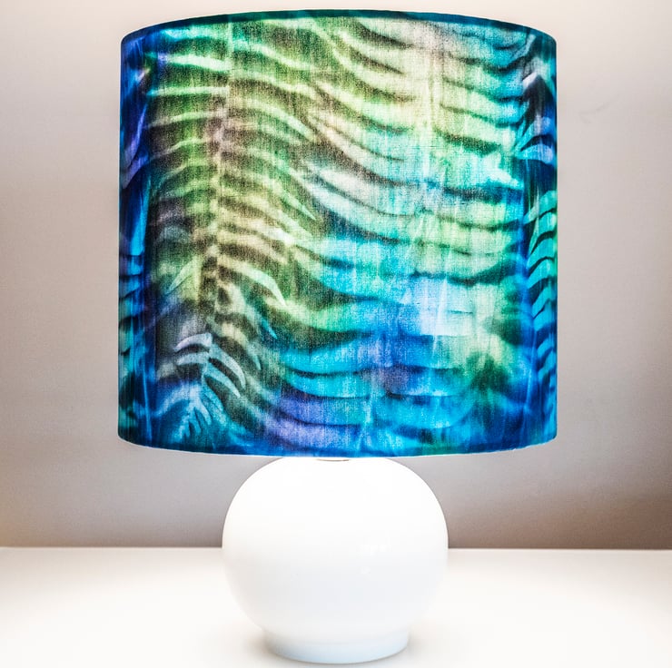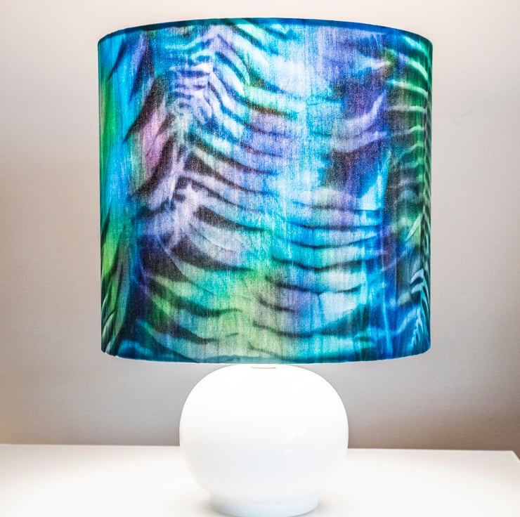 This beautiful lampshade is covered in 100% cotton which has been hand-dyed in South Africa using a process called sun printing. Leaves, ferns and seed pods from indigenous South African plants are combined with eco-friendly light sensitive dyes, and when the fabrics are exposed to the sun the image of the plant material remains. Every piece of fabric is a one-off creation, which is what makes these fabrics and the items they are used to make, so very special.