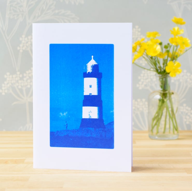 The lovely stripey Penmon lighthouse off the coast of Anglesey in North Wales is captured on this card design from an original Cyanotype.