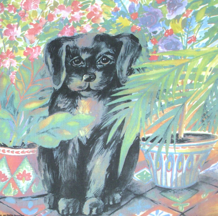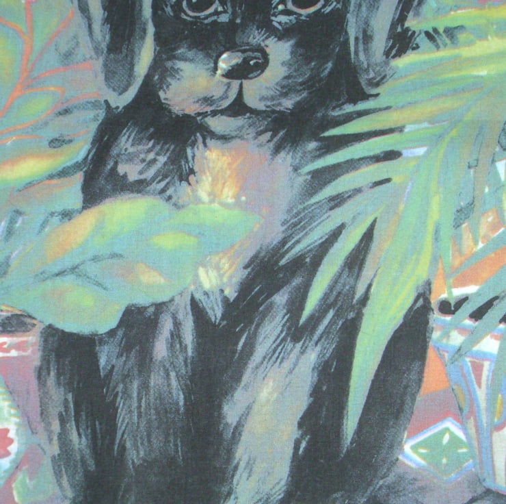 large cloth shopping bag with a little black puppy sitting among green potted plants in a conservatory, same design on both sides.