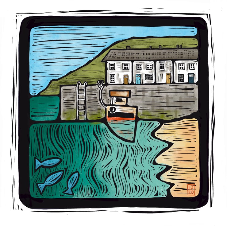 This print is from my “digital Lino”series of Cornish fishing boat and harbour illustrations. Inspired by the fishing villages that surround my home here in Cornwall.