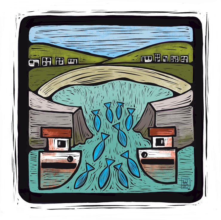 This print is from my “digital Lino”series of Cornish fishing boat and harbour illustrations. Inspired by the fishing villages that surround my home here in Cornwall.
