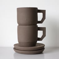Each is glazed in a brick red glaze which reacts with the clay minerals to give a rich chocolate brown colour. The geometric lines show the raw clay colour underneath, created by putting thin strips of masking tape on before the glaze is applied.