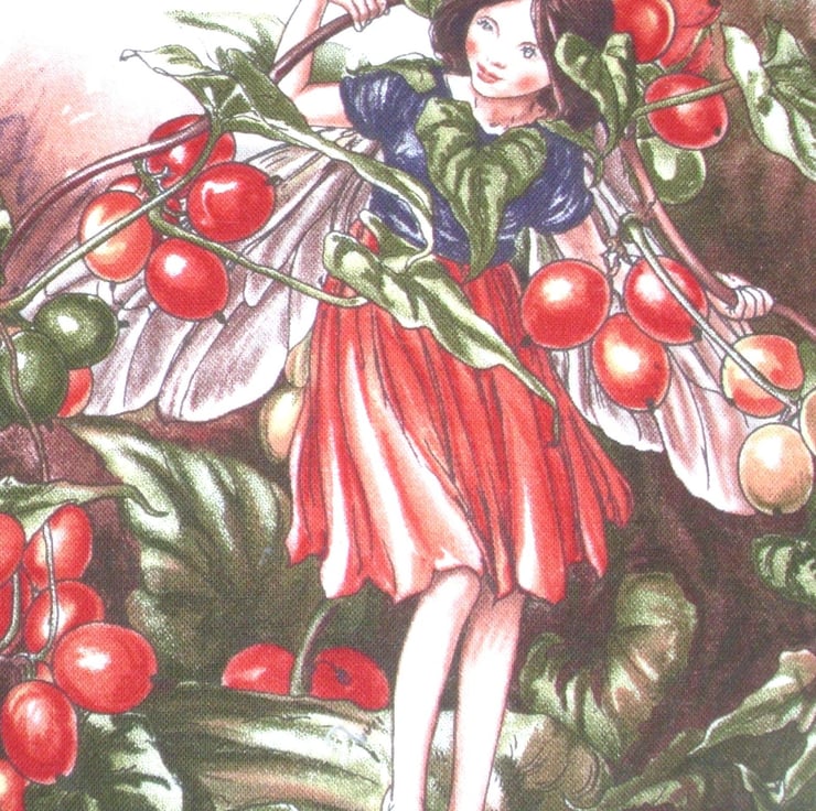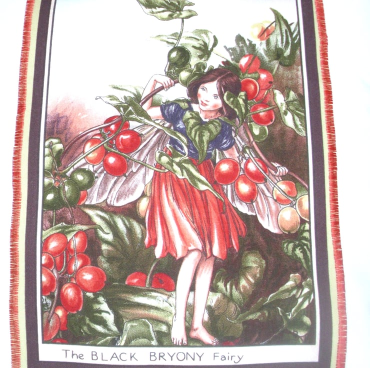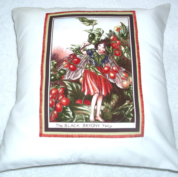 The Black Briony Fairy cushion with a little fairy in her pretty skirt of bright red skirt and top of purple standing among bright red and green berries and branches .