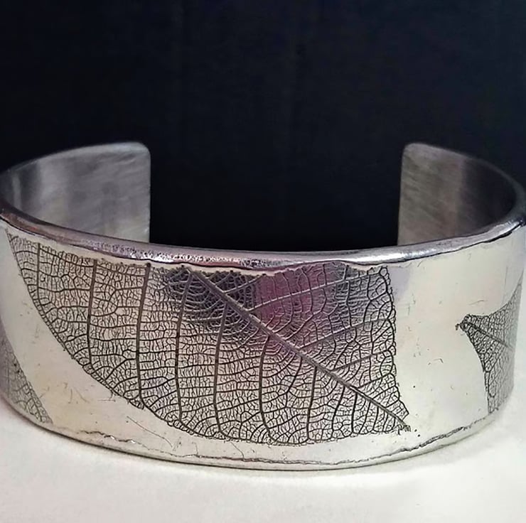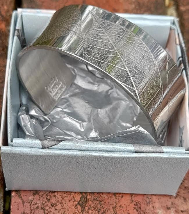 Hand made in Sheffield by Jim in his workshop. This is a Polished pewter cuff with an embossed leaf design. We also have pewter pendants and Brooches in this range.