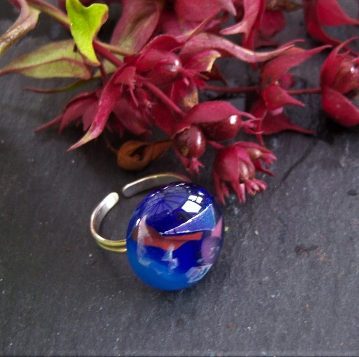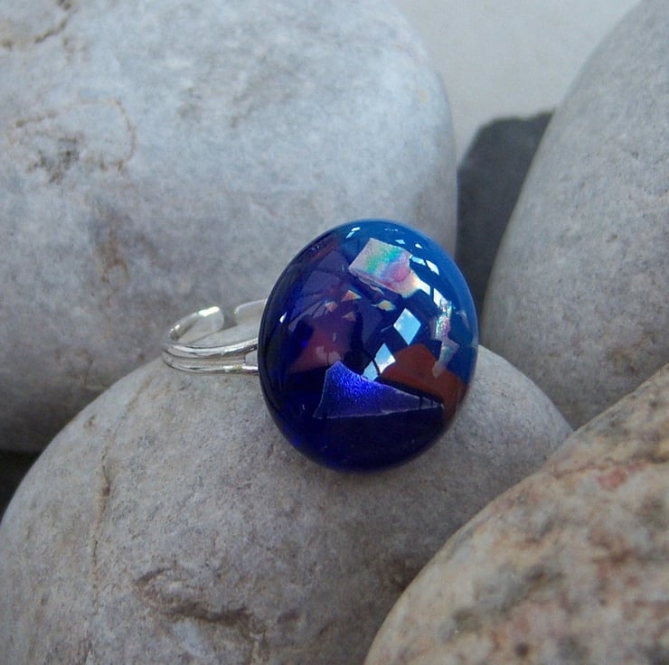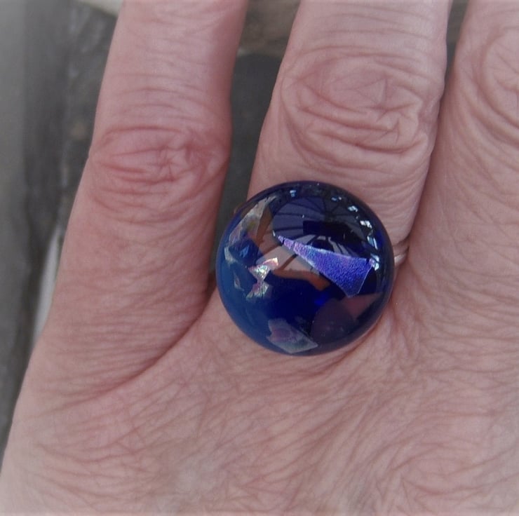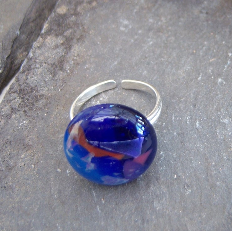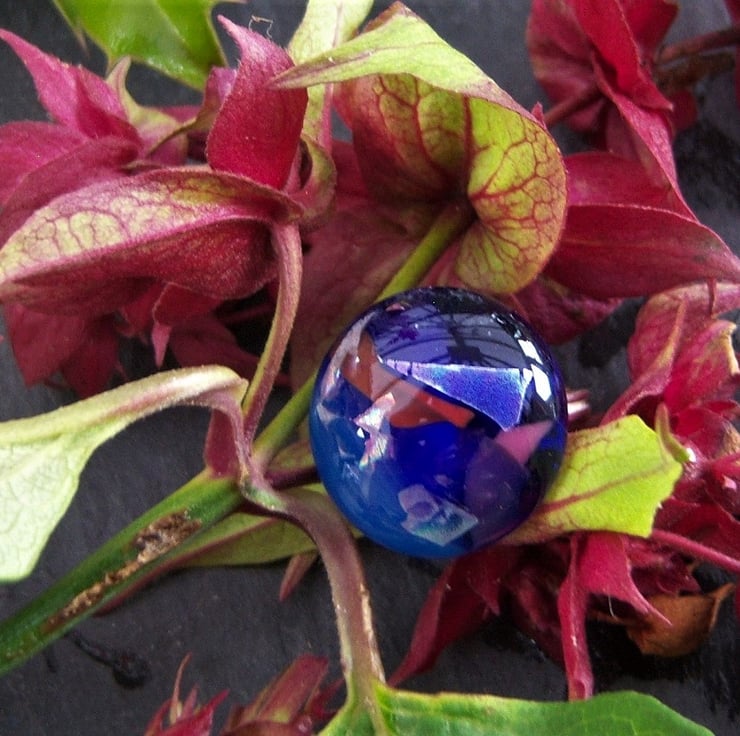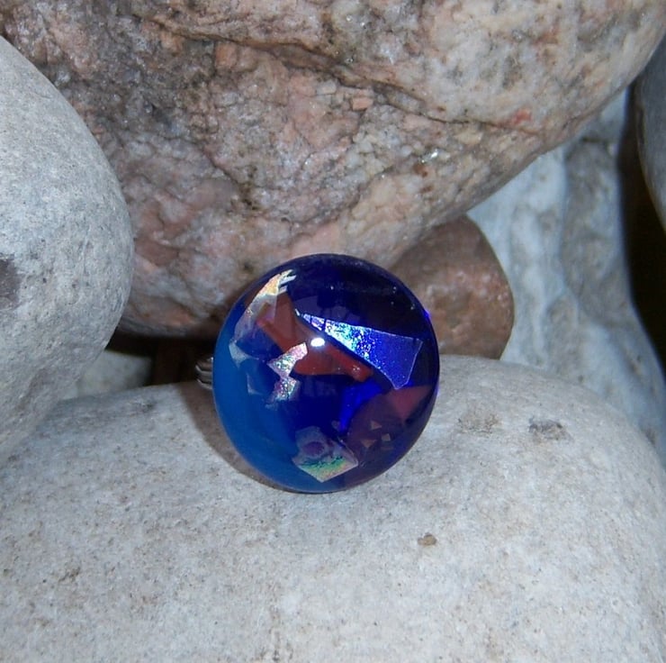 The dichroic glass, which is fired in a kiln, is random shades of blue, mauve and purple over a small area of orange. These can shimmer and vary, depending on the angle viewed. It measures approximately 2cms across.