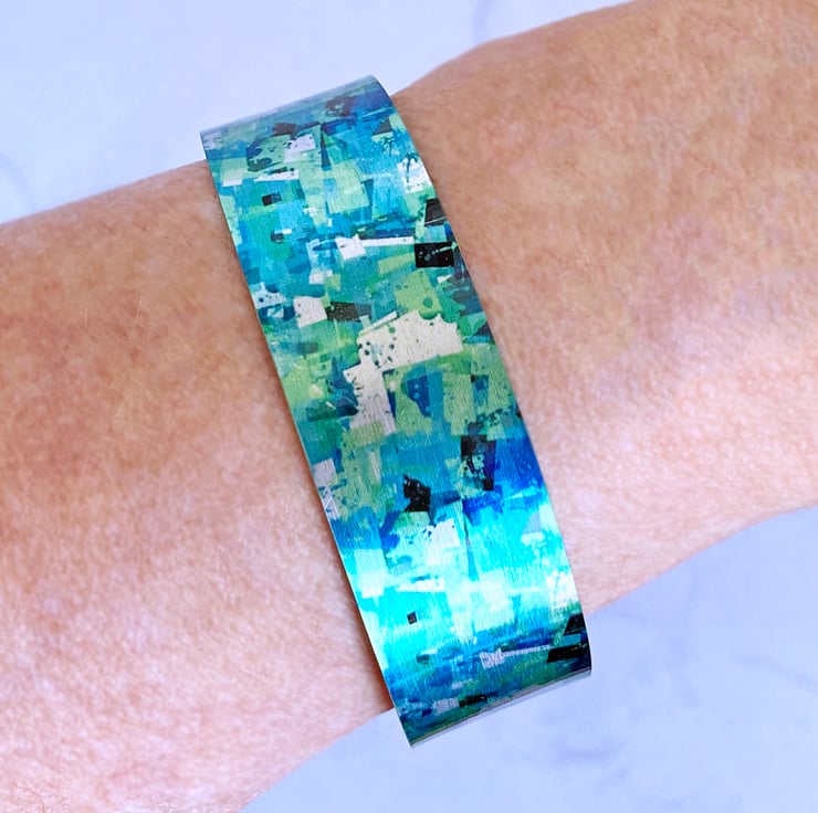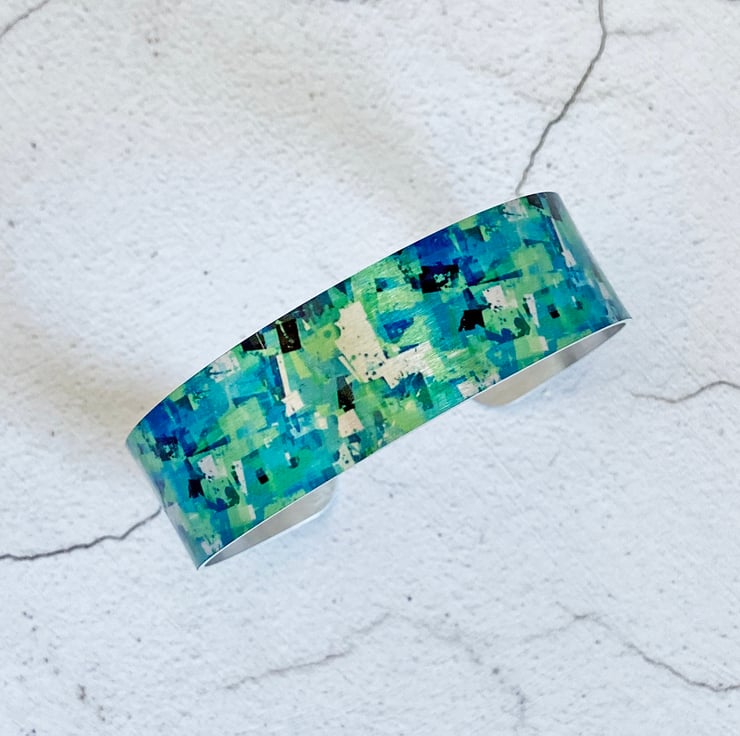 I've handmade this bracelet from aluminium with an abstract turquoise, blue, green design. Matching earrings and necklace are available. In addition, the reverse can be engraved with a personal message (Optional)