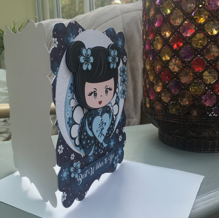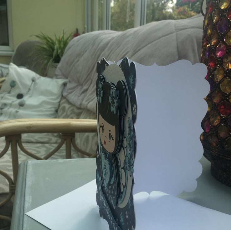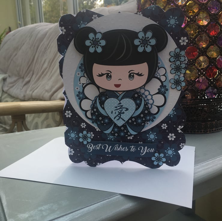 A cute little japanese girl adorned with flowers and wearing a Kimono. A lovely way to celebrate a birthday. This could be for a anyone, Japan obsessed or not. It is an unashamedly feminine, girly card. The Japanese girl is wearing a blue floral Kimono and has matching flowers in her hair. She is layered on a matching floral disc and then on top of a white floral embossed disc. The card is in a matching paper and decorated with flowers, it is a fancy label shaped card. The greeting is Best wishes to you. The card is blank inside for your own message. The card is approximately A5 in size.