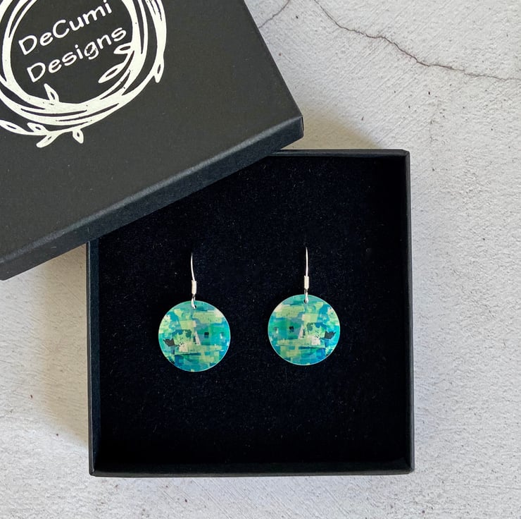 I have handmade the discs and artwork for these earrings, and the drops have a striking abstract turquoise design. Matching bracelet and pendant available.