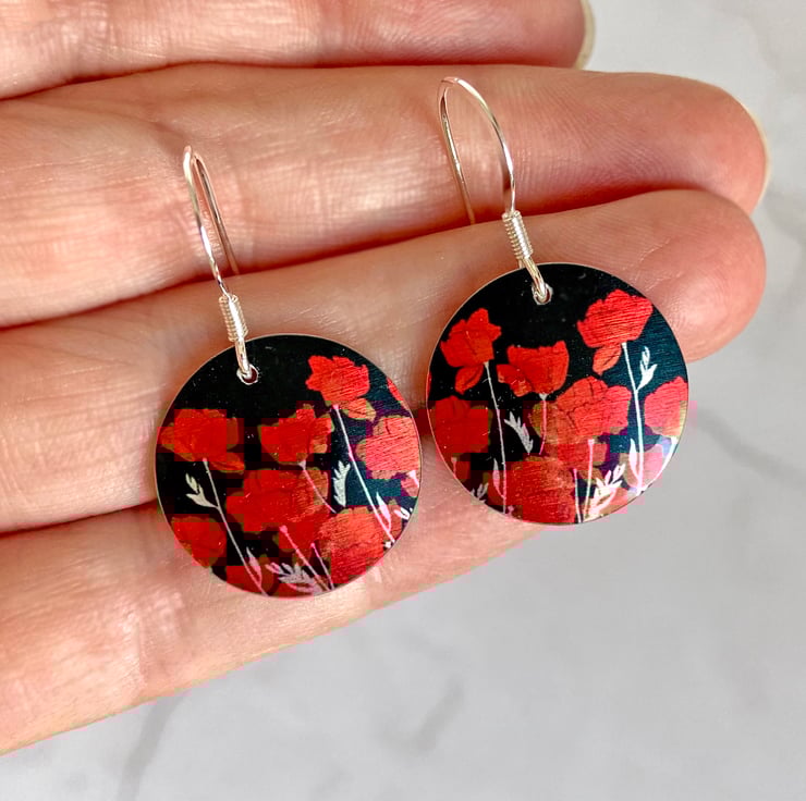 I have handmade the discs and artwork for these earrings, and the drops have a pretty poppy floral design. Matching necklace and bracelet are available, design 644.