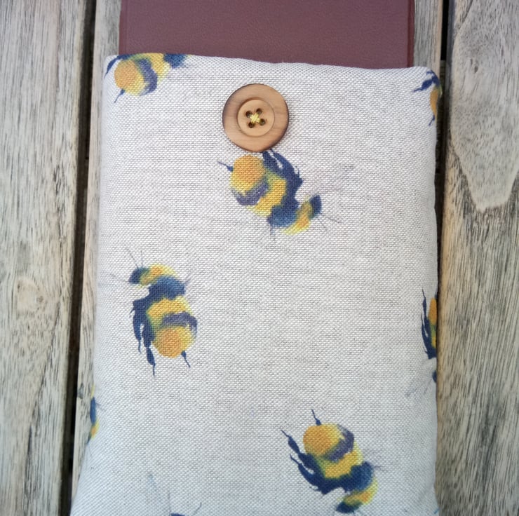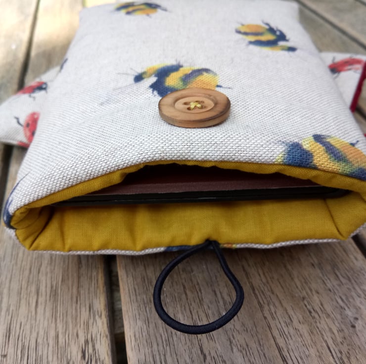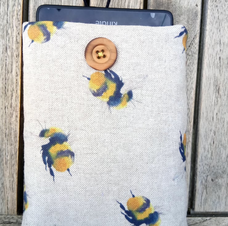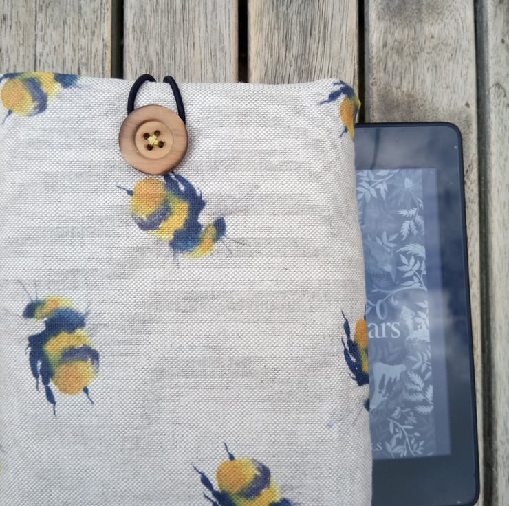 This is a handmade kindle paperwhite cover in a beautiful bee design on linen blend fabric, which has a lovely contrasting mustard cotton lining. It closes with an elastic loop over a button. I have used thick wadding to protect your kindle, so keeping it safe when travelling or even just left in a drawer.