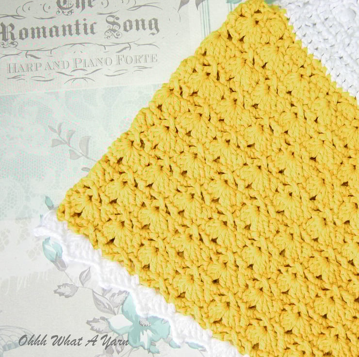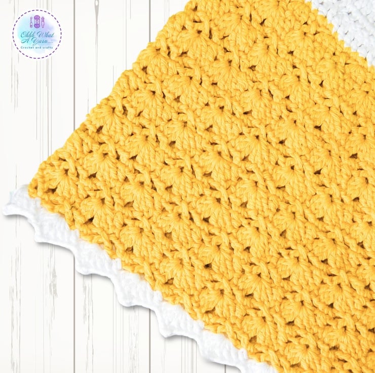 The body of the dress is bright yellow and has a lovely shell and lacy pattern and it has the same decorative shell edging along the bottom in a white.