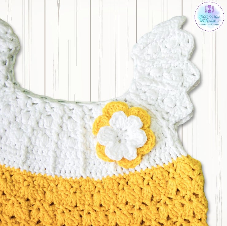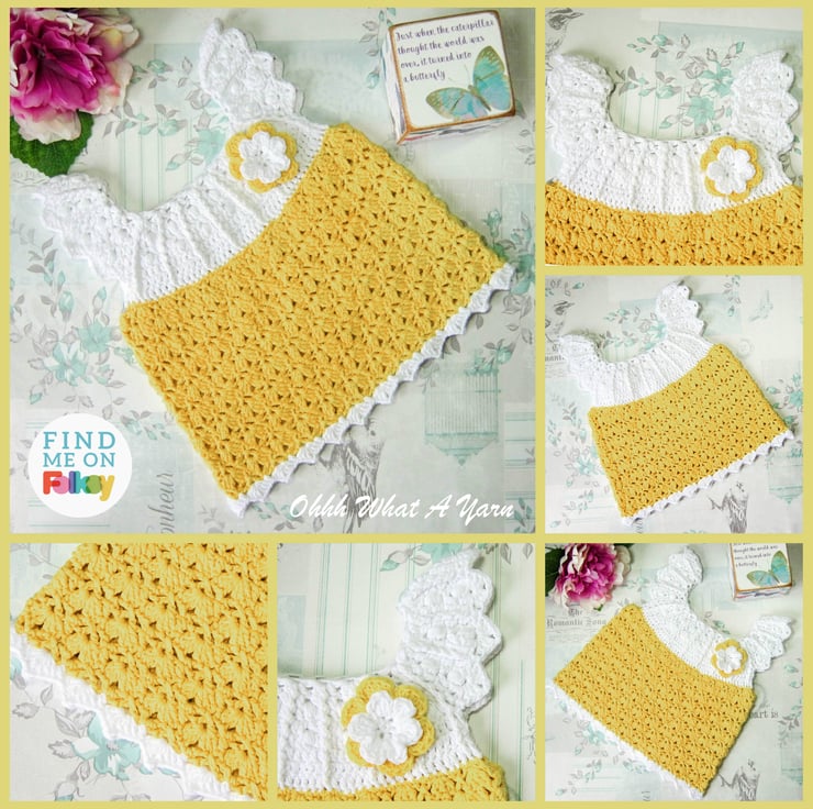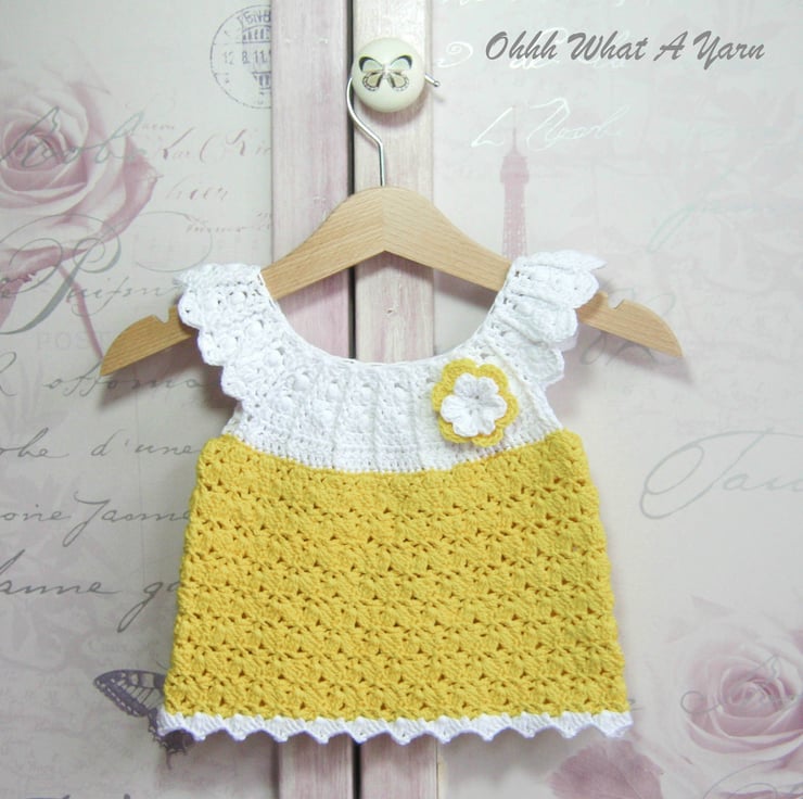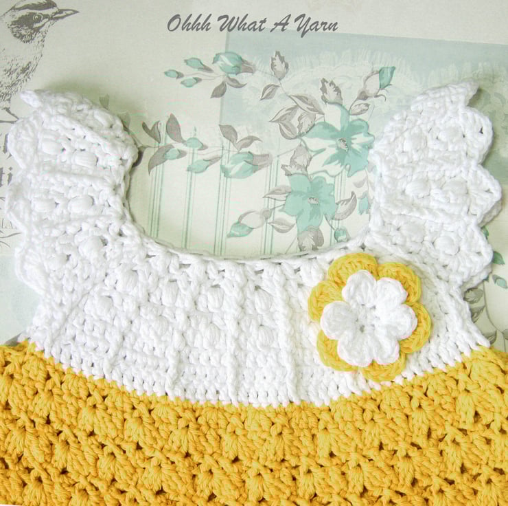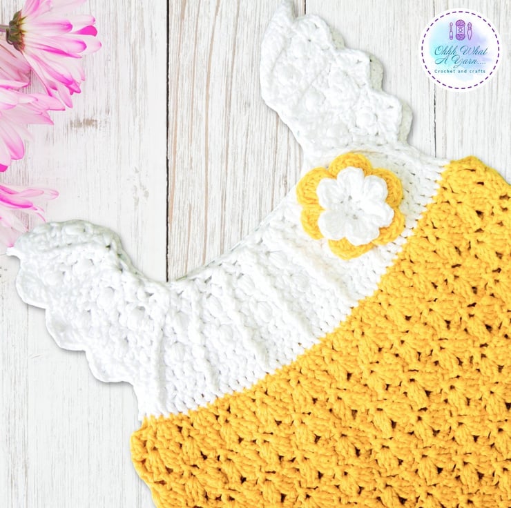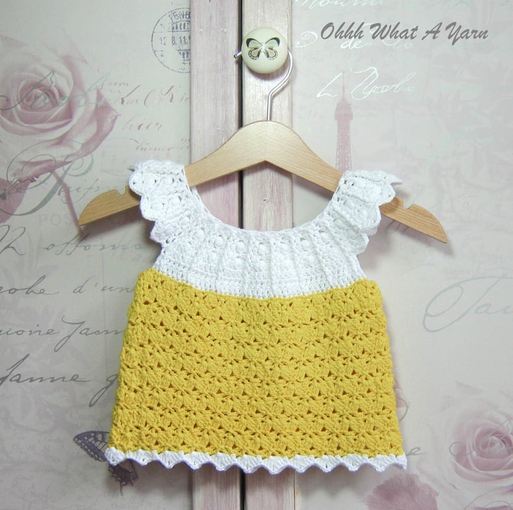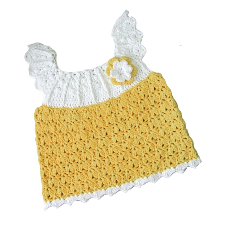 This gorgeous yellow and white baby sun dress has been crocheted using gorgeous Drops lightweight 4 ply 100% cotton yarn.