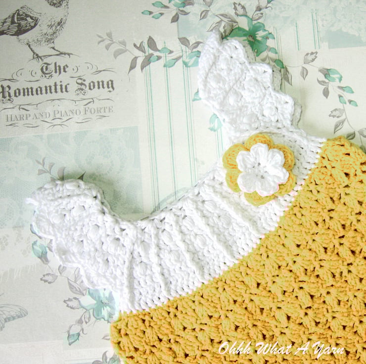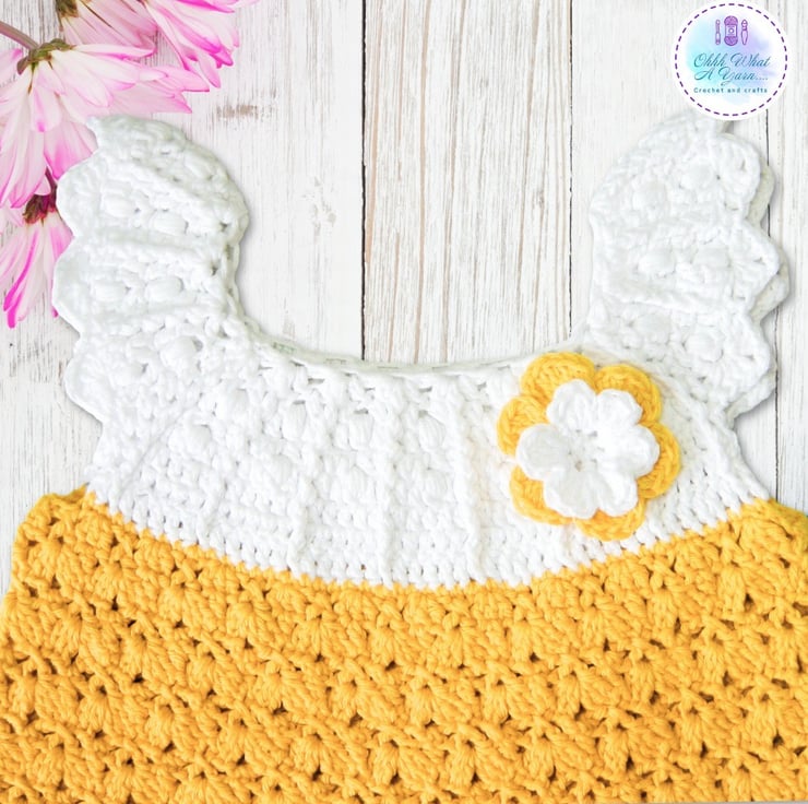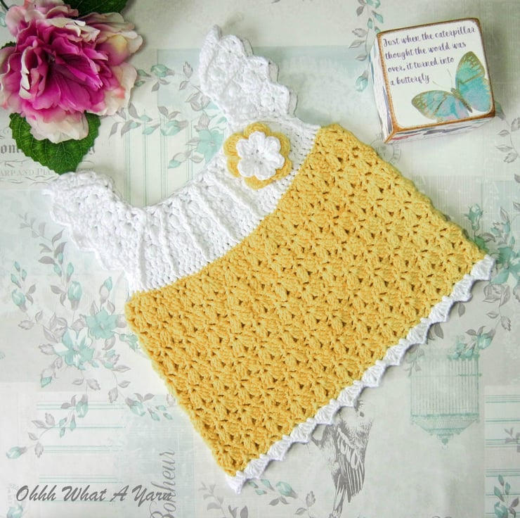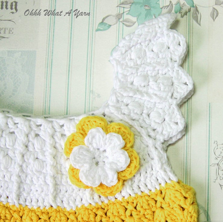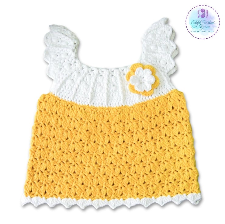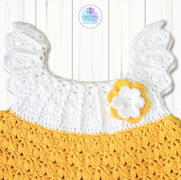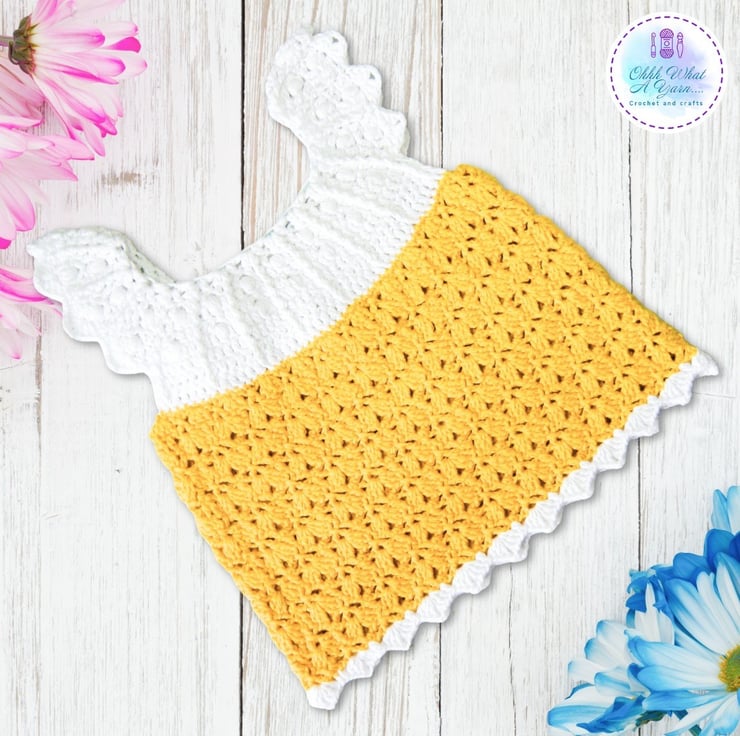 This gorgeous yellow and white baby sun dress has been crocheted using gorgeous Drops lightweight 4 ply 100% cotton yarn.