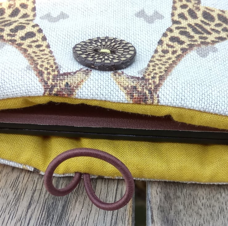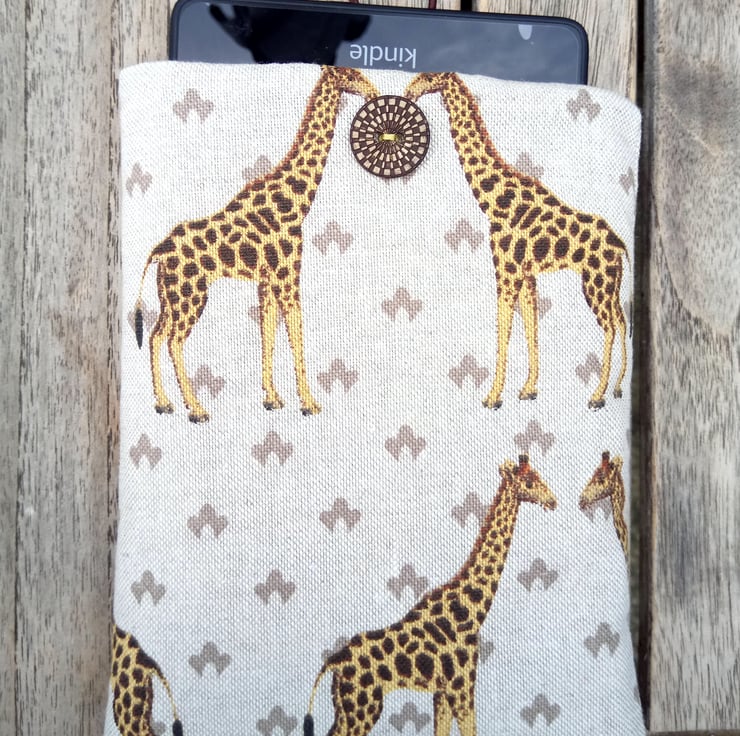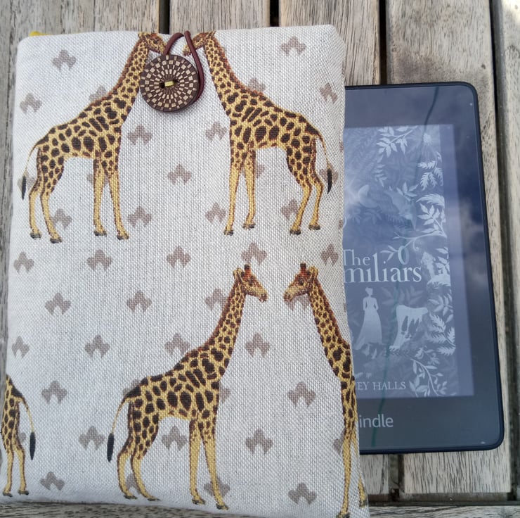 This a handmade kindle case in a lovely giraffe design in a linen blend fabric. The case closes with an elastic loop over a button. To keep your kindle safe and protected, it is padded with wadding and lined in a contrasting mustard yellow cotton fabric.