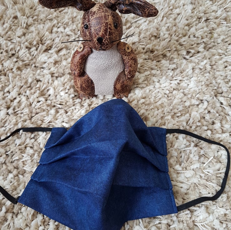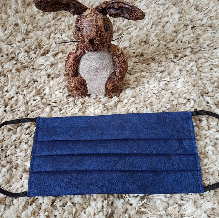 Adult face covering made from a navy blue mottled cotton. The face mask is made with 2 layers of cotton forming an inner pocket for a filter (not included) and is fastened over the ears with 2 loops of elastic and a toggle adjuster.