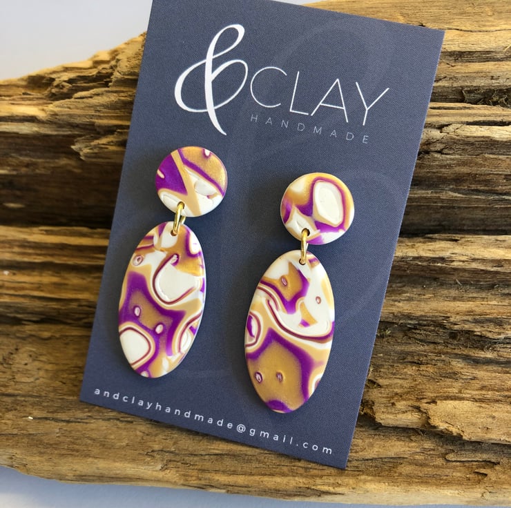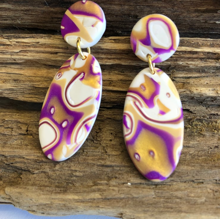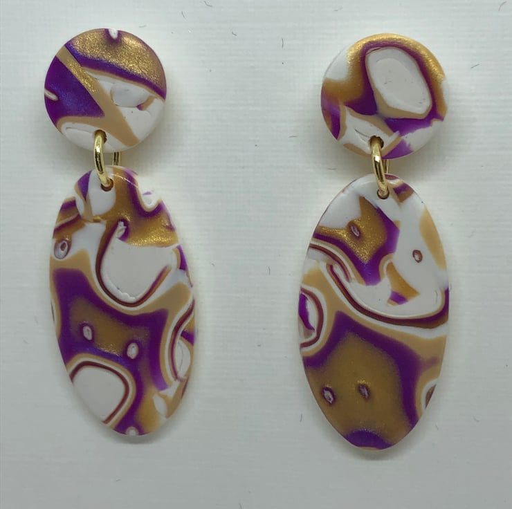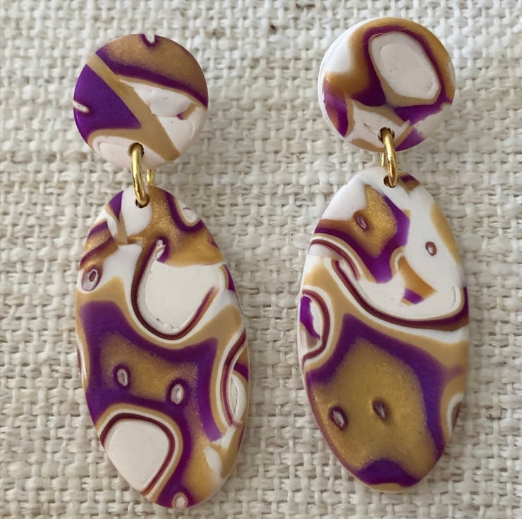 Beautiful oval earrings in purple, white, gold and ecru, made from Premo Sculpey polymer clay and using the mokume gane technique. They are very light weight.