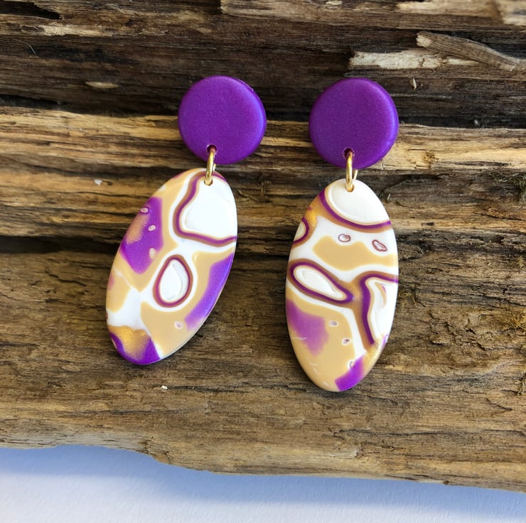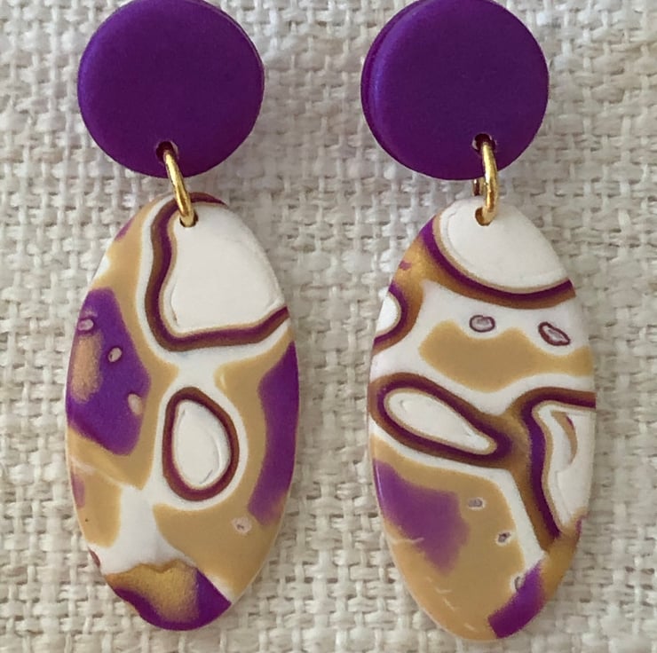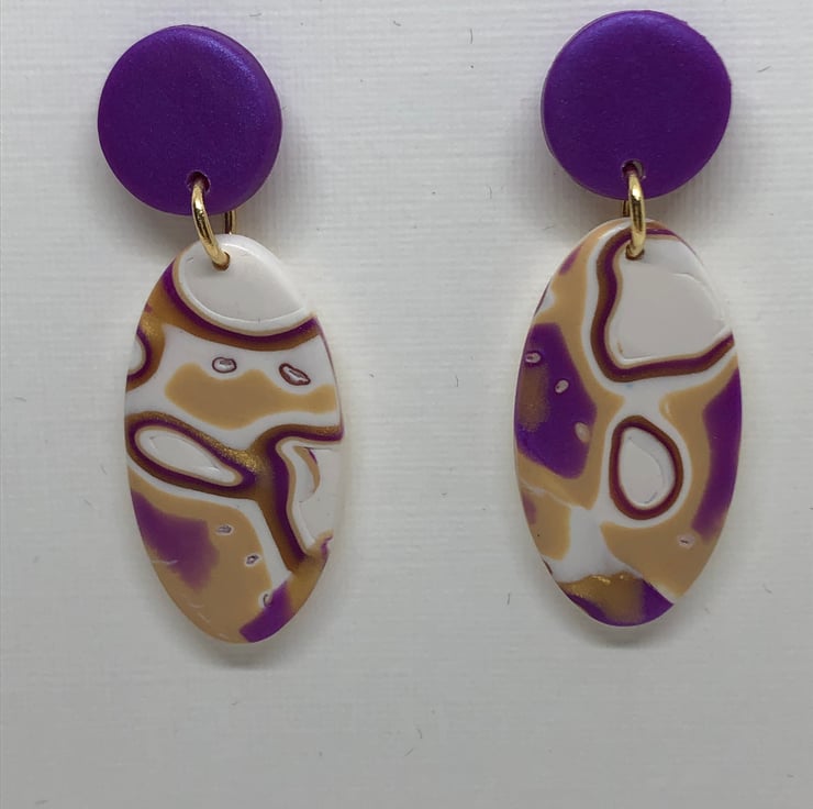 Beautiful oval earrings in purple, white, gold and ecru, with purple stud. Made from Premo Sculpey polymer clay and using the mokume gane technique. They are very light weight.
