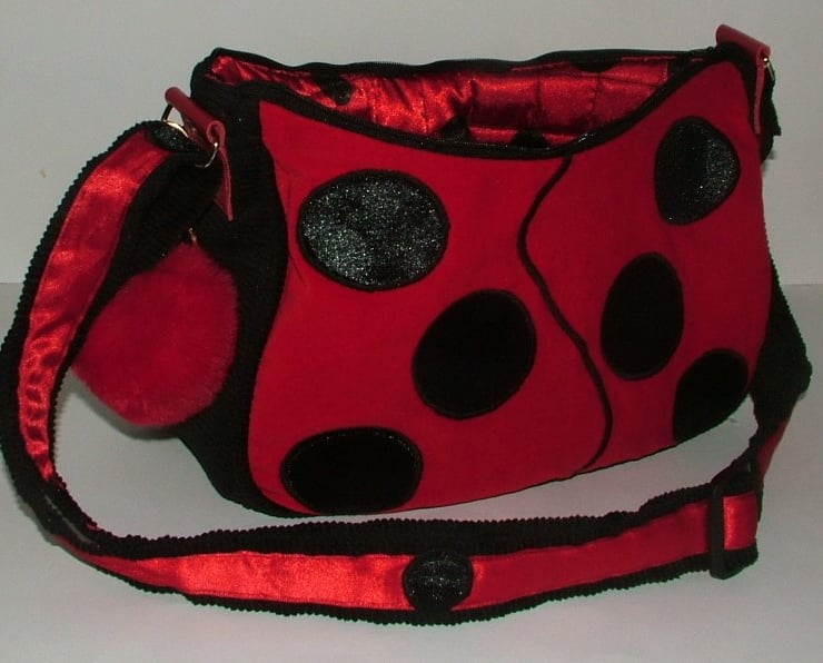 The back is made from a rich red velvet that has 6 black velvet spots with black zigzag stitching.