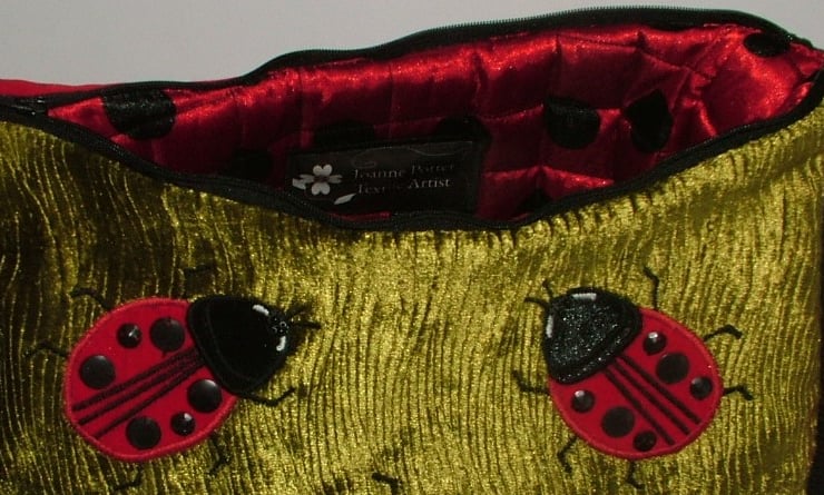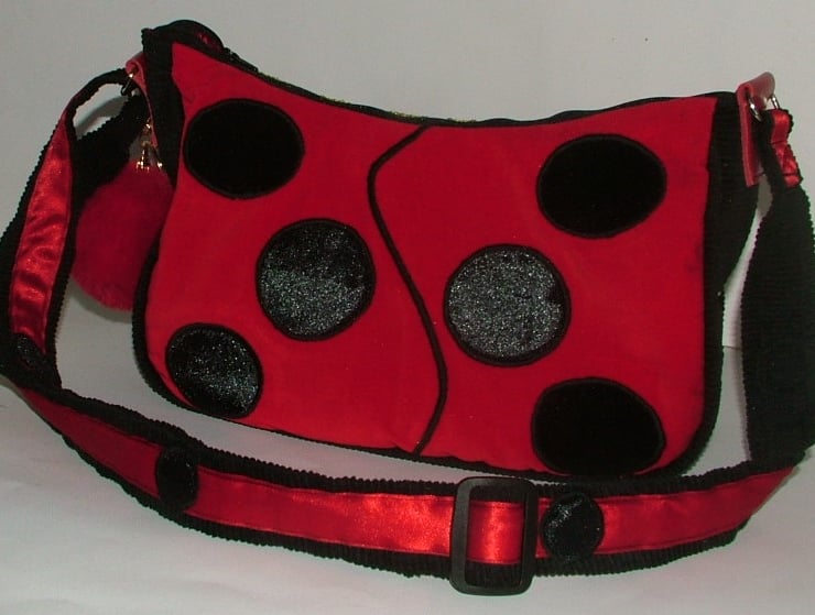 A vibrant handbag made from a gorgeous green fabric and three lovable Ladybirds.