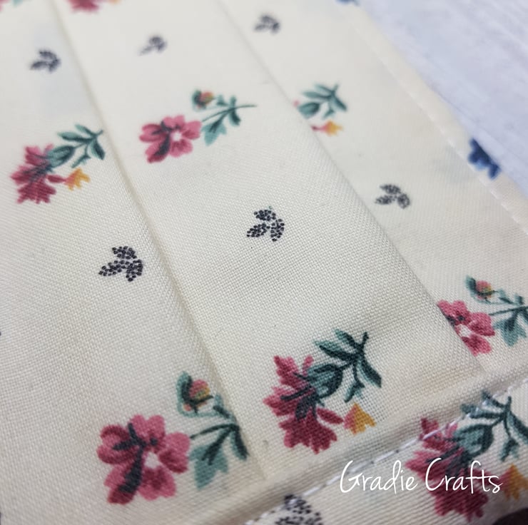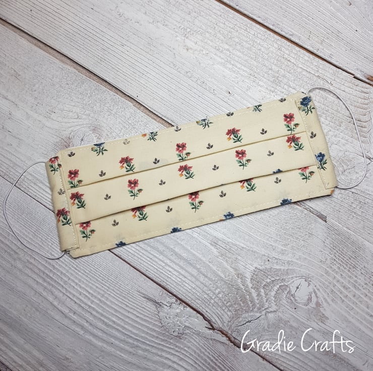100% cotton, triple layer face covering with white cotton back, floral print front and soft, round elastic ear loops.