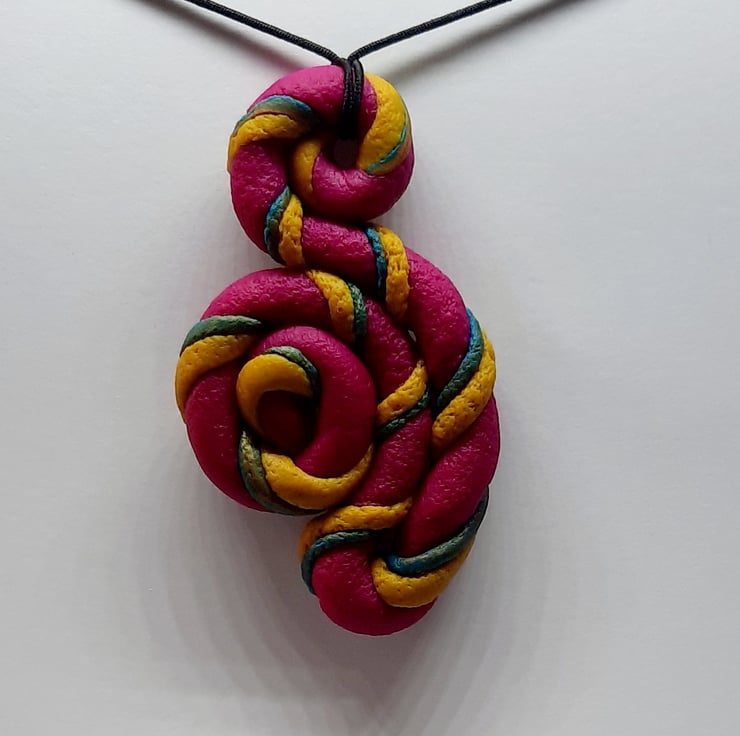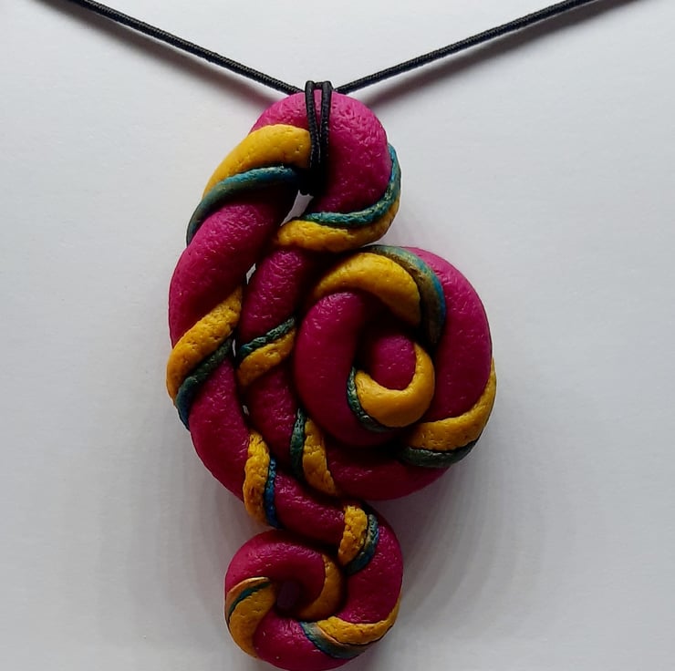 This twisted pendant is made using polymer clay, the design is purely random ensuring a one of a kind statement piece of art, the newly textured medium has a leather effect which looks pleasant and feels amazing.