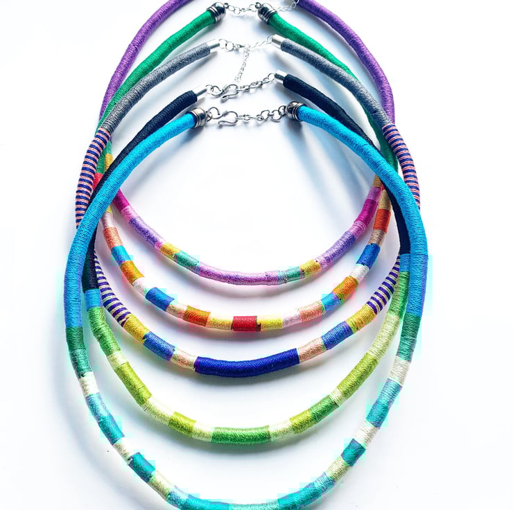 Brighten up your look with this unique & colorful textile statement necklace created from cotton rope that is hand-wrapped with cotton yarn. Enjoy the easy on - easy off : The necklace comes with a high quality closure