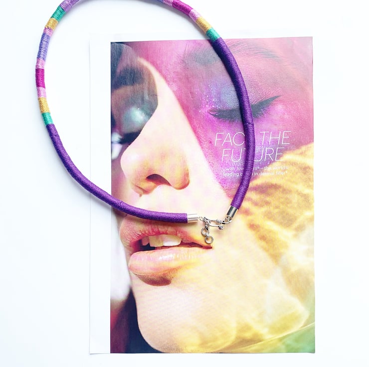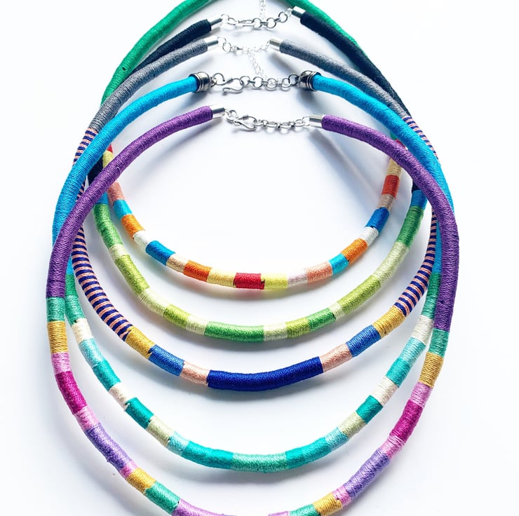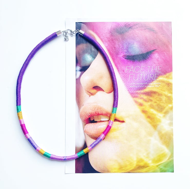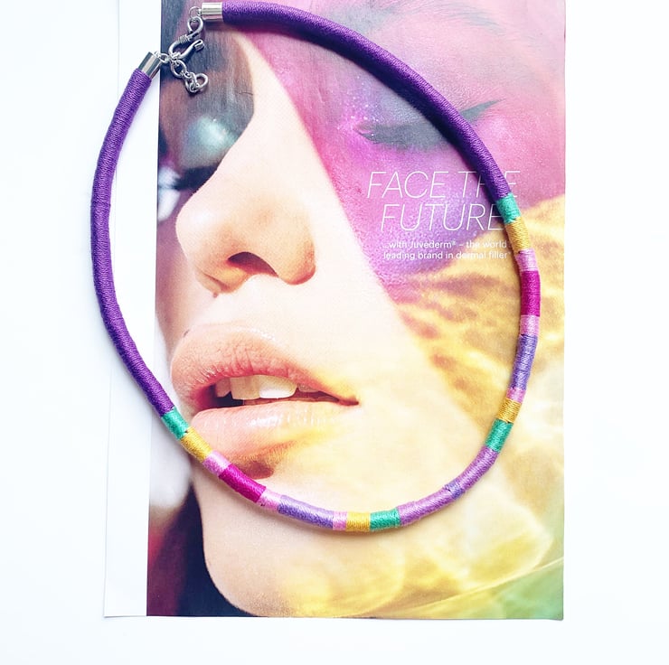 A gorgeous statement necklace from the new collection, featuring the popular wrapped cotton yarn and all those beautiful colors! A high qualtiy piece, made from cotton rope, hand-wrapped with cotton yarn. This necklace is a true eye-catcher that will not go unnoticed. Very lightweight!