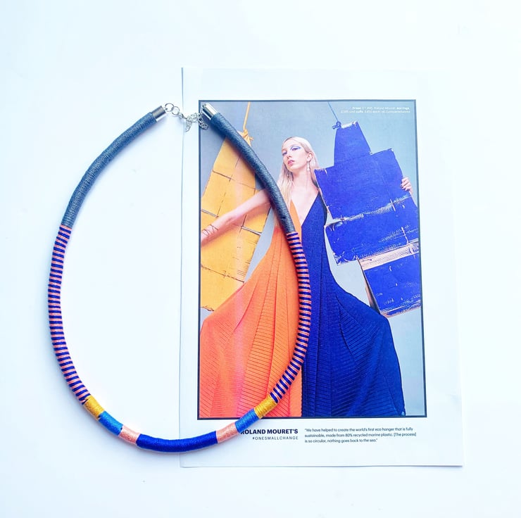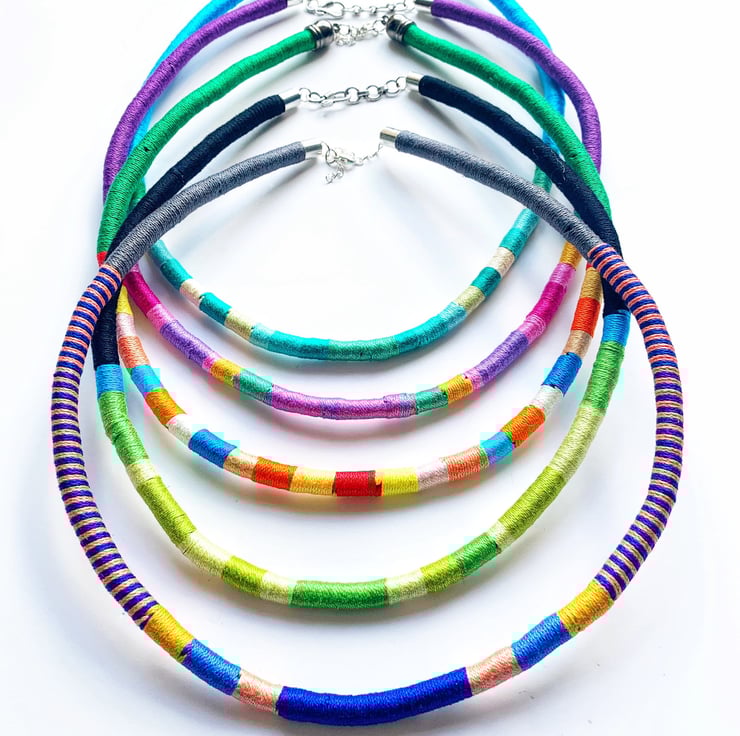 A gorgeous statement necklace from the new collection, featuring the popular wrapped cotton yarn and all those beautiful colors! A high qualtiy piece, made from cotton rope, hand-wrapped with cotton yarn. This necklace is a true eye-catcher that will not go unnoticed. Very lightweight!