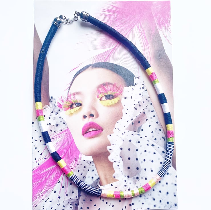 A gorgeous statement necklace from the new collection, featuring the popular wrapped cotton yarn and all those beautiful colors! A high qualtiy piece, made from cotton rope, hand-wrapped with cotton yarn. This necklace is a true eye-catcher that will not go unnoticed. Very lightweight!