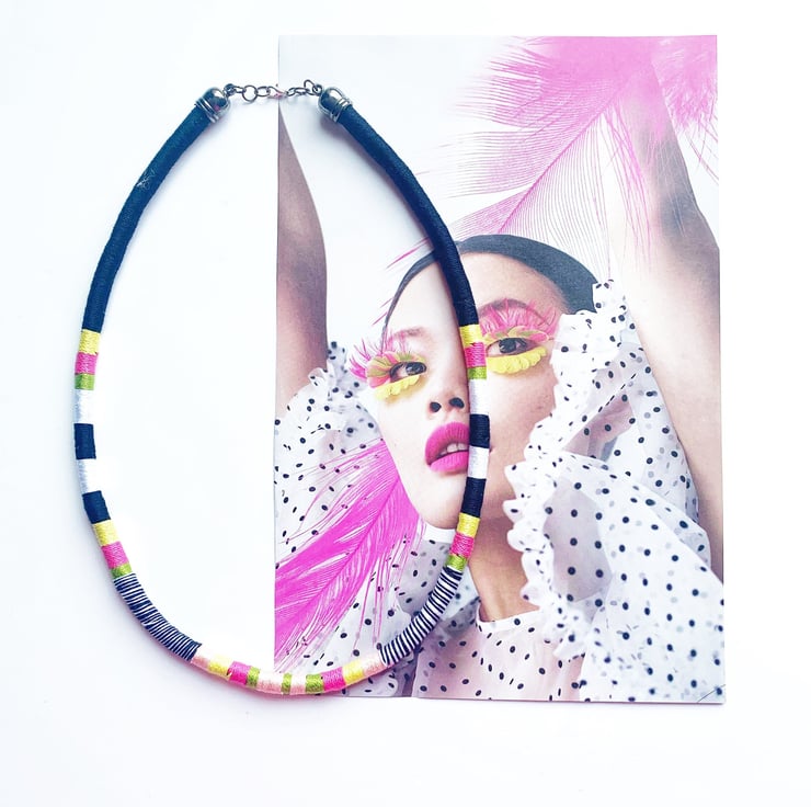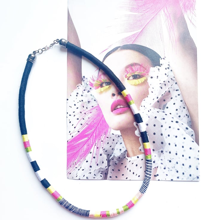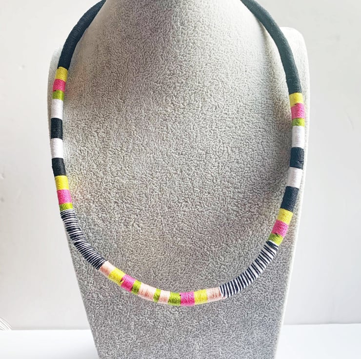 A gorgeous statement necklace from the new collection, featuring the popular wrapped cotton yarn and all those beautiful colors! A high qualtiy piece, made from cotton rope, hand-wrapped with cotton yarn. This necklace is a true eye-catcher that will not go unnoticed. Very lightweight!