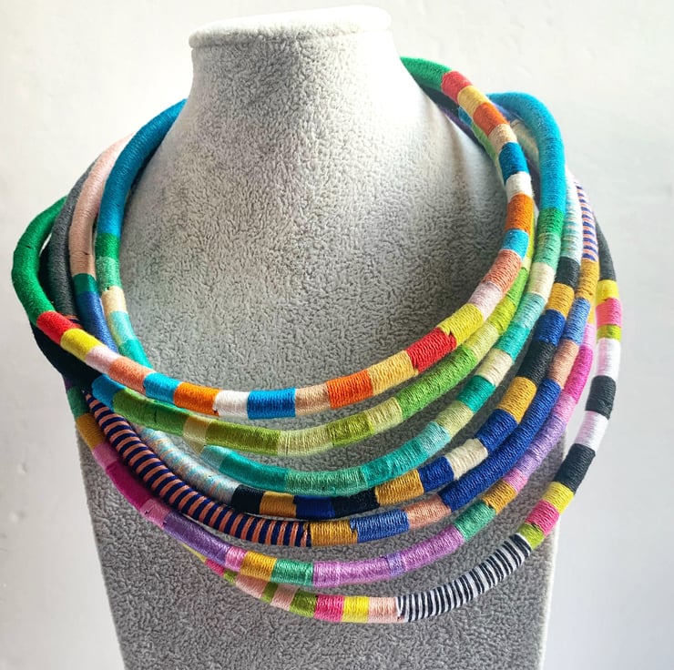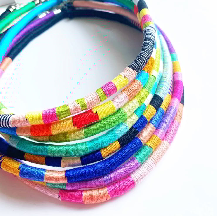 Brighten up your look with this unique & colorful textile statement necklace created from cotton rope that is hand-wrapped with cotton yarn. Enjoy the easy on - easy off : The necklace comes with a high quality closure
