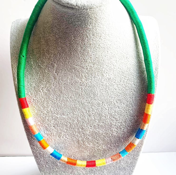 Brighten up your look with this unique & colorful textile statement necklace created from cotton rope that is hand-wrapped with cotton yarn. Enjoy the easy on - easy off : The necklace comes with a high quality closure