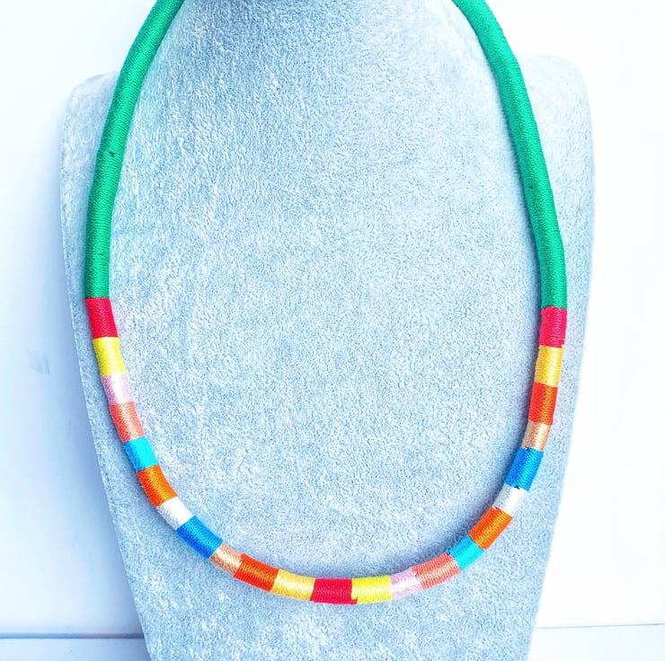 A gorgeous statement necklace from the new collection, featuring the popular wrapped cotton yarn and all those beautiful colors! A high quality piece, made from cotton rope, hand-wrapped with cotton yarn. This necklace is a true eye-catcher that will not go unnoticed. Very lightweight!
