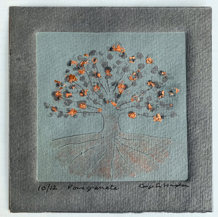 Like trees of life and the pomegranate is an emblem of love. The bronze colour toned well with the Hawthorn light grey printing ink.