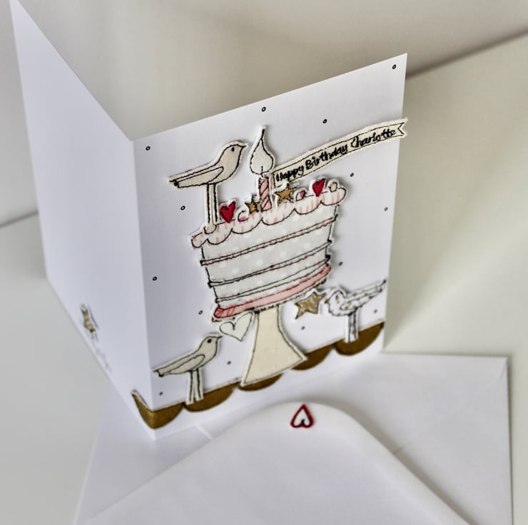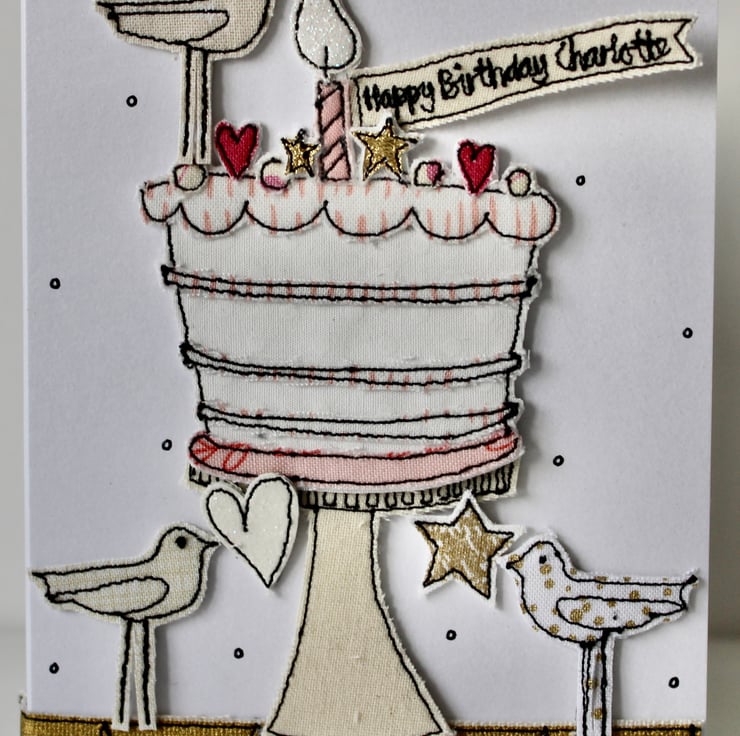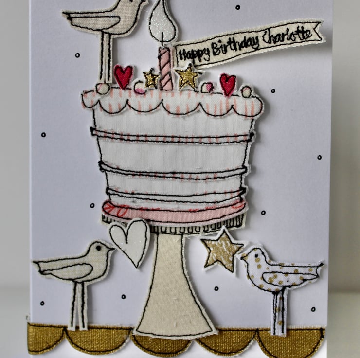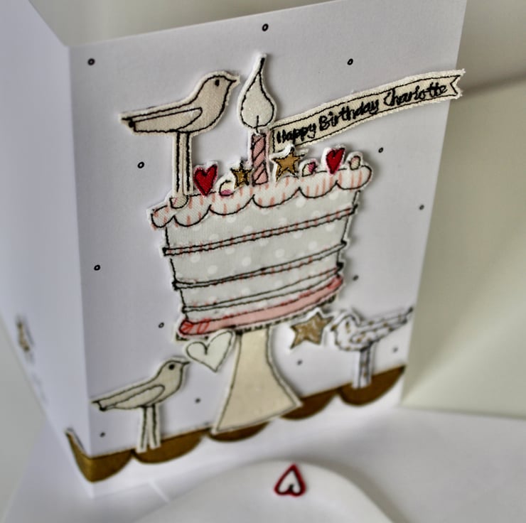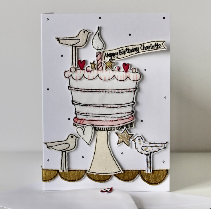 Each card has been sewn by me and my sewing machine, using cotton cloth, metallic cloth and glitter cloth; making each totally unique.