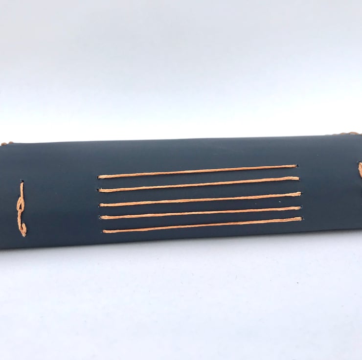 A smooth navy blue leather with a fabulous bright and colourful floral material lining attached. The notebook is hand stitched around the edge and contains 200 blank sheets of plain white paper which are then hand stitched to the leather in 5 signatures.