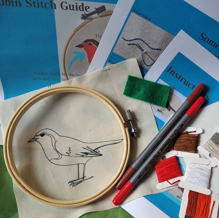 The kit comes with my robin design already printed onto organic cotton calico which has a lovely natural creamy colour and a few little specks that add a bit of texture and interest. You start your kit using the fabric markers to give you a lovely colourful base to work over. Also included are several colours of stranded cotton, more than enough to complete the project and have some spare for your next piece! I've also included a 13 cm embroidery hoop, a needle, a bead for the eye, instructions, stitch guide and baking parchment (for ironing!)