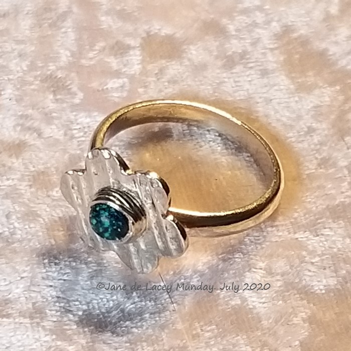 Turquoise glitter fused glass set on textured fine silver floweron a fine silver ring band.