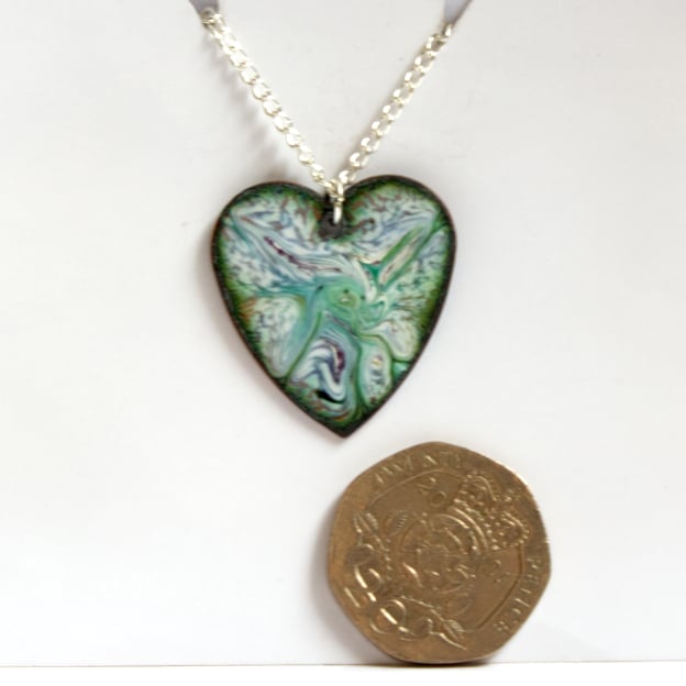 The heart measures 23mm by 25mm. It is mounted on a 45cm silver plate, curb chain that fastens with a simple bolt ring.